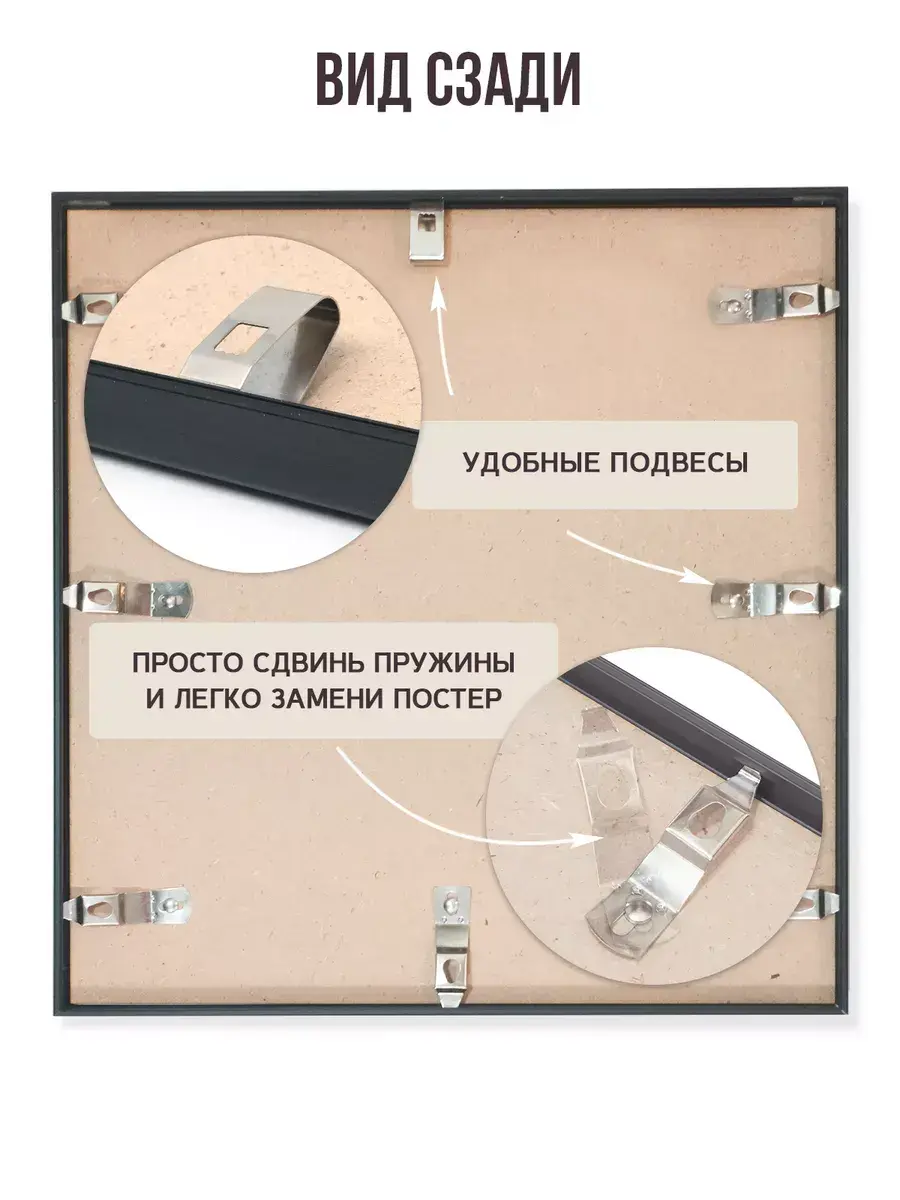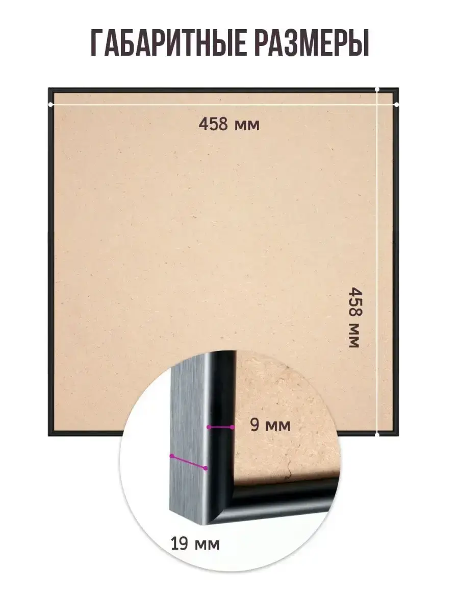 Брашированная алюминиевая рамка 45х45 см с быстрой сменой изображения. Достоинства фоторамки 45х45 см: крепкий стильный металлический каркас; прозрачная вставка из ПЭТ; небольшой вес. Основным преимуществом перед другими металлическими фоторамками 45 на 45 (типа Нельсон) является суперудобная и супербыстрая смена вложений: нужно просто сдвинуть прижимные пружины. В рамки 45 на 45 см можно вставить: постеры; фотографии; пазлы, алмазную мозаику, вышивку и т. д. Рамку для фото 45х45 см можно вешать и вертикально, и горизонтально. Металлические рамки 45х45 см изготовлены из анодированного алюминиевого профиля, укомплектованы жестким задником из оргалита 3 мм, защитным прозрачным пластиком ПЭТ 0,5 мм, металлическими пружинами/подвесами для фиксации вложения и размещения рамки на стене. Внимание! В рамке 45х45 см для постеров мы используем прозрачную вставку из ПЭТ толщиной 0,5 мм, а не стекло. Фоторамка 45х45 получается легкой и безопасной - её невозможно разбить даже намеренно. При этом эстетические свойства рамки 45 на 45 см не теряются: ПЭТ не искажает изображение и обеспечивает 100%-ю прозрачность. Внимание! Перед первым использованием рамки для картины 45х45 с пластиковой вставки необходимо снять защитную пленку с двух сторон! Внимание! Наши рамки 45 на 45 не предназначены для использования вне помещений.