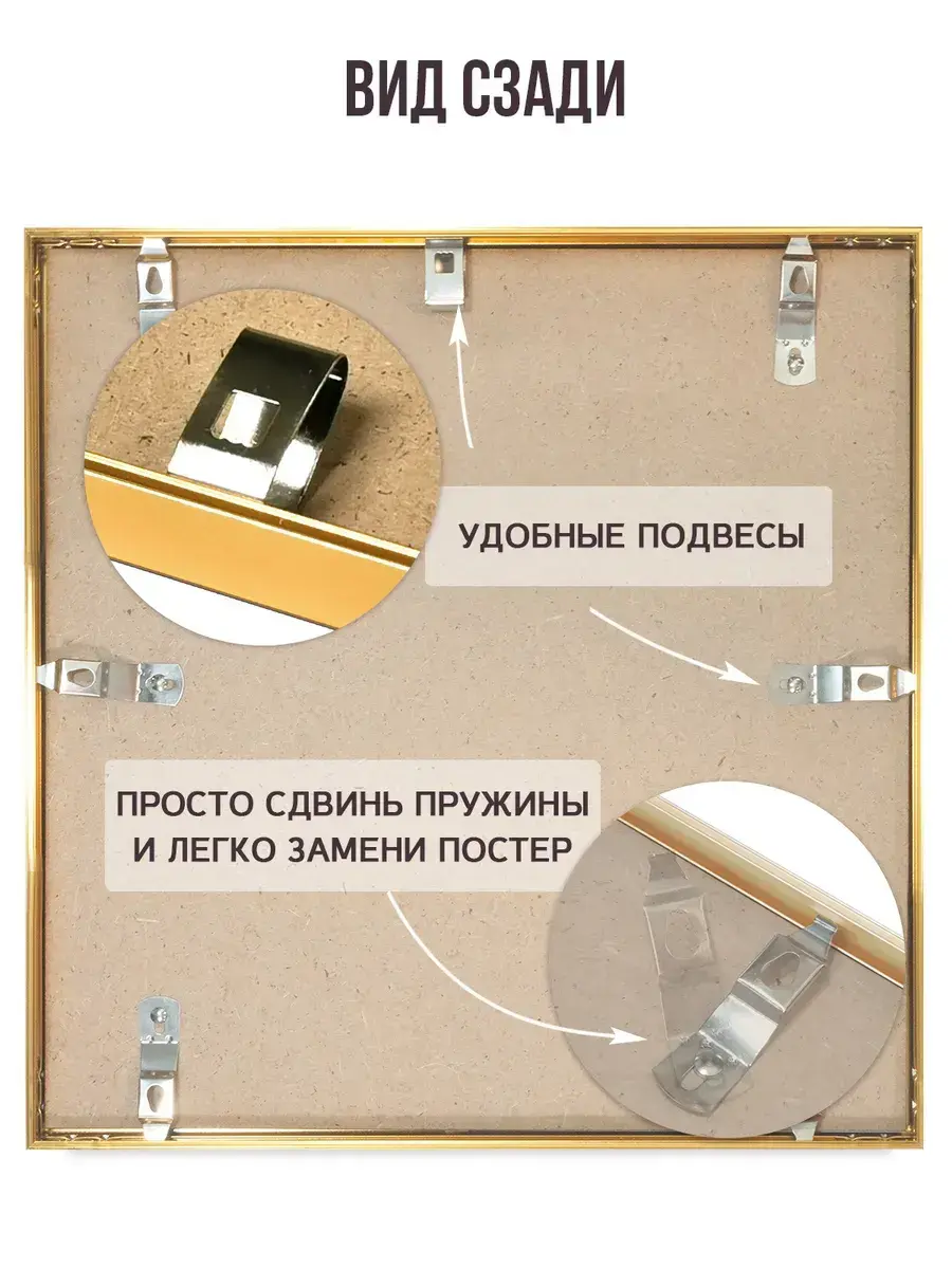 Брашированная алюминиевая рамка 40х40 см с быстрой сменой изображения. Достоинства фоторамки 40х40 см: крепкий стильный металлический каркас; прозрачная вставка из ПЭТ; небольшой вес. Основным преимуществом перед другими металлическими фоторамками 40 на 40 (типа Нельсон) является суперудобная и супербыстрая смена вложений: нужно просто сдвинуть прижимные пружины. В рамки 40 на 40 см можно вставить: постеры; фотографии; пазлы, алмазную мозаику, вышивку и т. д. Рамку для фото 40х40 см можно вешать и вертикально, и горизонтально. Металлические рамки 40х40 см изготовлены из анодированного алюминиевого профиля, укомплектованы жестким задником из оргалита 3 мм, защитным прозрачным пластиком ПЭТ 0,5 мм, металлическими пружинами/подвесами для фиксации вложения и размещения рамки на стене. Внимание! В рамке 40х40 см для постеров мы используем прозрачную вставку из ПЭТ толщиной 0,5 мм, а не стекло. Фоторамка 40х40 получается легкой и безопасной - её невозможно разбить даже намеренно. При этом эстетические свойства рамки 40 на 40 см не теряются: ПЭТ не искажает изображение и обеспечивает 100%-ю прозрачность. Внимание! Перед первым использованием рамки для картины 40х40 с пластиковой вставки необходимо снять защитную пленку с двух сторон! Внимание! Наши рамки 40 на 40 не предназначены для использования вне помещений.