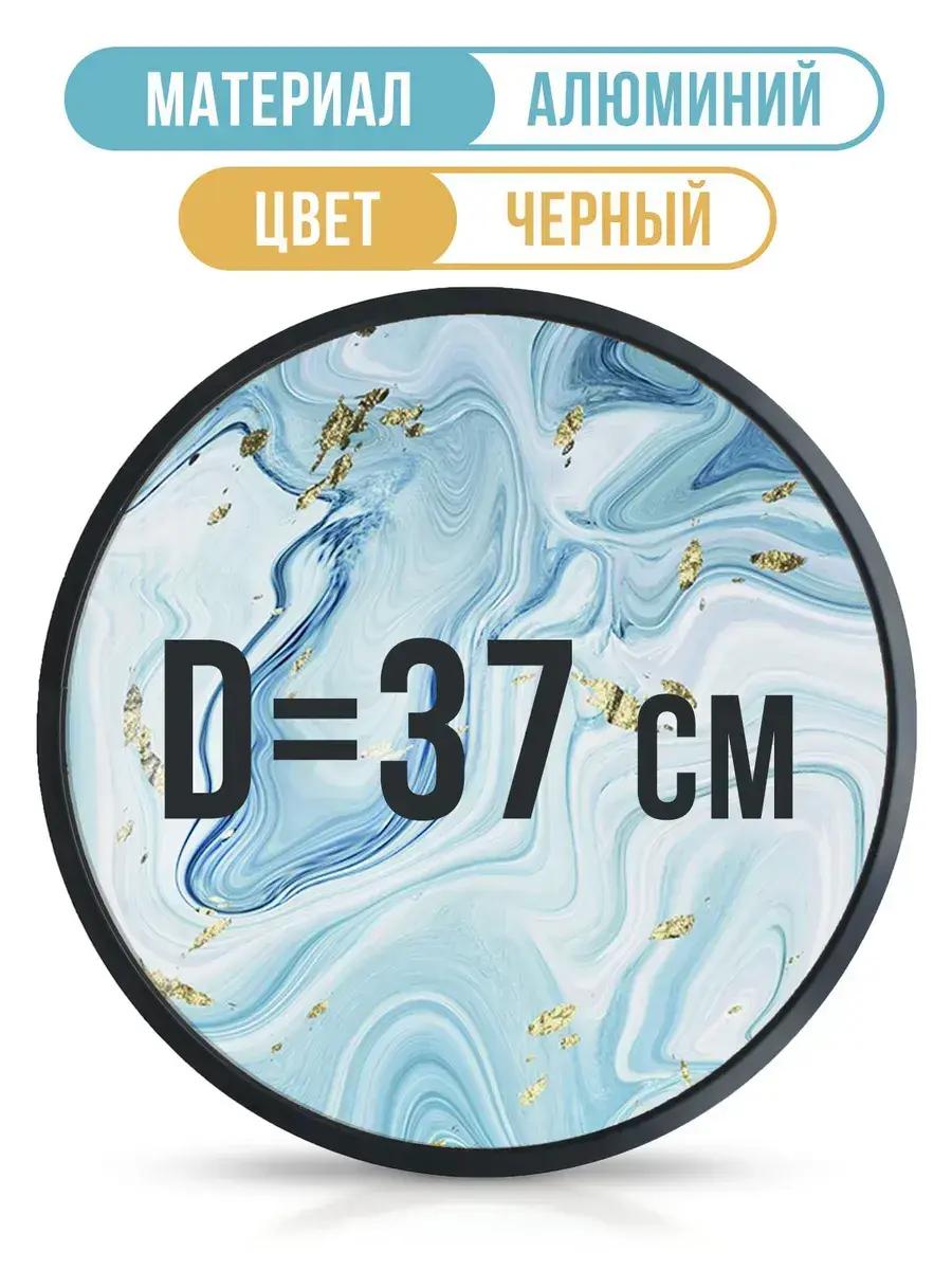 Круглая алюминиевая фоторамка 37 см. Габаритные размеры круглой металлической фоторамки - 378 мм. Диаметр видимой части - 360 мм. В круглую алюминиевую рамку 370 мм можно вставить постер, фото, алмазную мозаику, пазл, вышивку, зеркало, а также любую вставку, толщина которой не превышает 10 мм.\n\nКруглая металлическая рамка 37 см выполнена из легкого алюминия с красивой брашированной текстурой.\n\nВ рамку для фото 37 см очень просто вставить изображение. Прижимные пружины вытаскиваются и вставляются без малейших усилий, но держат плотно и надежно. Подвес фоторамки также вставляется очень легко и свободно перемещается на любую точку окружности.\n\nВместо стекла мы используем прозрачный пластик ПЭТ. Фоторамка 37 см получается легкой и безопасной - её невозможно разбить даже намеренно. При этом эстетические свойства круглой металлической рамки не теряются: ПЭТ не искажает изображение и обеспечивает абсолютную прозрачность. Не забудьте снять защитную пленку с прозрачной вставки с ДВУХ сторон\n\nПроизведено в России.