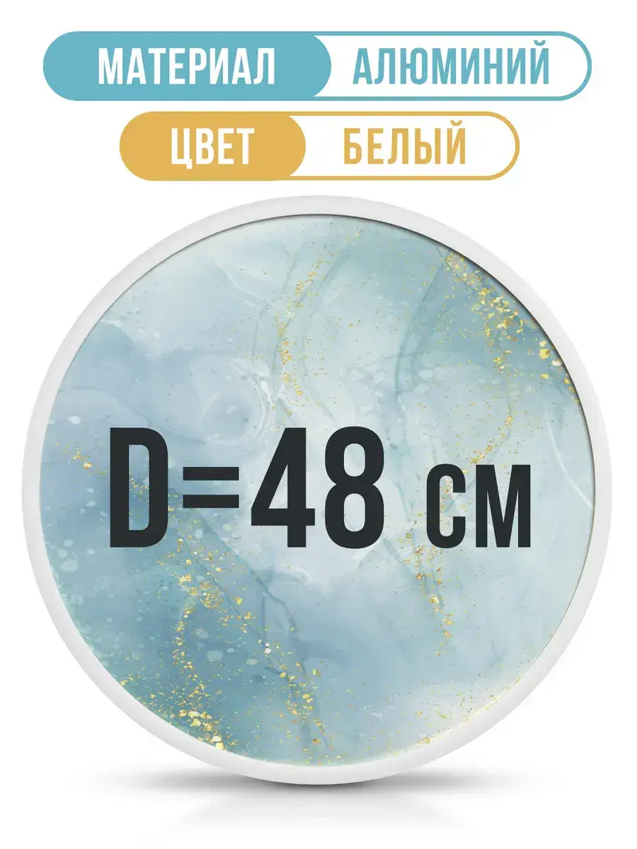 Круглая алюминиевая фоторамка 48 см. Габаритные размеры круглой металлической фоторамки - 488 мм. Диаметр видимой части - 470 мм. В круглую алюминиевую рамку 480 мм можно вставить постер, фото, алмазную мозаику, пазл, вышивку, зеркало, а также любую вставку, толщина которой не превышает 10 мм. Круглая металлическая рамка 48 см выполнена из легкого алюминия с красивой брашированной текстурой. В рамку для фото 48 см очень просто вставить изображение. Прижимные пружины вытаскиваются и вставляются без малейших усилий, но держат плотно и надежно. Подвес фоторамки также вставляется очень легко и свободно перемещается на любую точку окружности. Вместо стекла мы используем прозрачный пластик ПЭТ. Фоторамка 48 см получается легкой и безопасной - её невозможно разбить даже намеренно. При этом эстетические свойства круглой металлической рамки для вышивки не теряются: ПЭТ не искажает изображение и обеспечивает абсолютную прозрачность. Не забудьте снять защитную пленку с прозрачной вставки с ДВУХ сторон! Произведено в России.