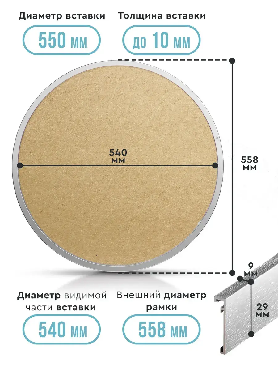 Круглая алюминиевая фоторамка 55 см. Габаритные размеры круглой металлической фоторамки - 558 мм. Диаметр видимой части - 540 мм. В круглую алюминиевую рамку 550 мм можно вставить постер, фото, алмазную мозаику, пазл, вышивку, зеркало, а также любую вставку, толщина которой не превышает 10 мм. Круглая металлическая рамка 55 см выполнена из легкого алюминия с красивой брашированной текстурой. В рамку для фото 55 см очень просто вставить изображение. Прижимные пружины вытаскиваются и вставляются без малейших усилий, но держат плотно и надежно. Подвес фоторамки также вставляется очень легко и свободно перемещается на любую точку окружности. Вместо стекла мы используем прозрачный пластик ПЭТ. Фоторамка 55 см получается легкой и безопасной - её невозможно разбить даже намеренно. При этом эстетические свойства круглой металлической рамки не теряются: ПЭТ не искажает изображение и обеспечивает абсолютную прозрачность. Не забудьте снять защитную пленку с прозрачной вставки с ДВУХ сторон! Произведено в России.