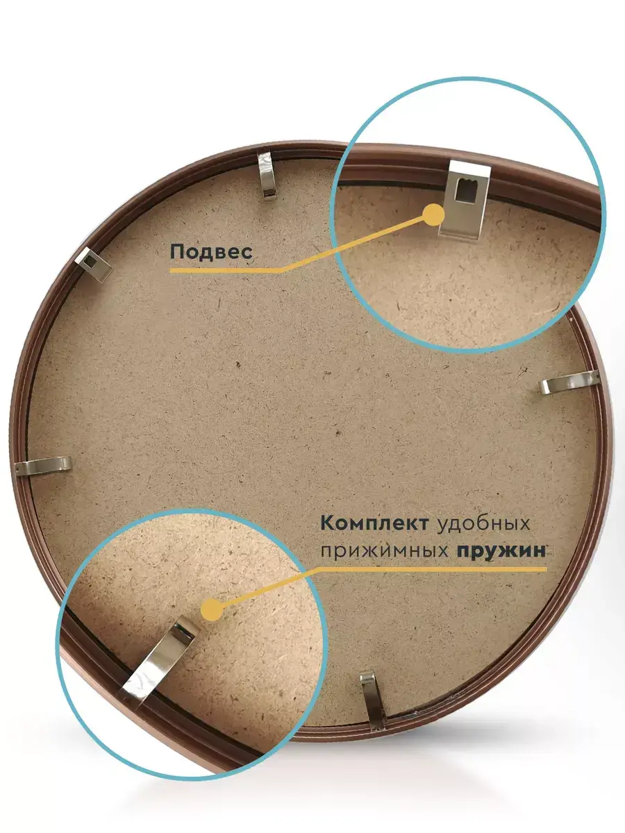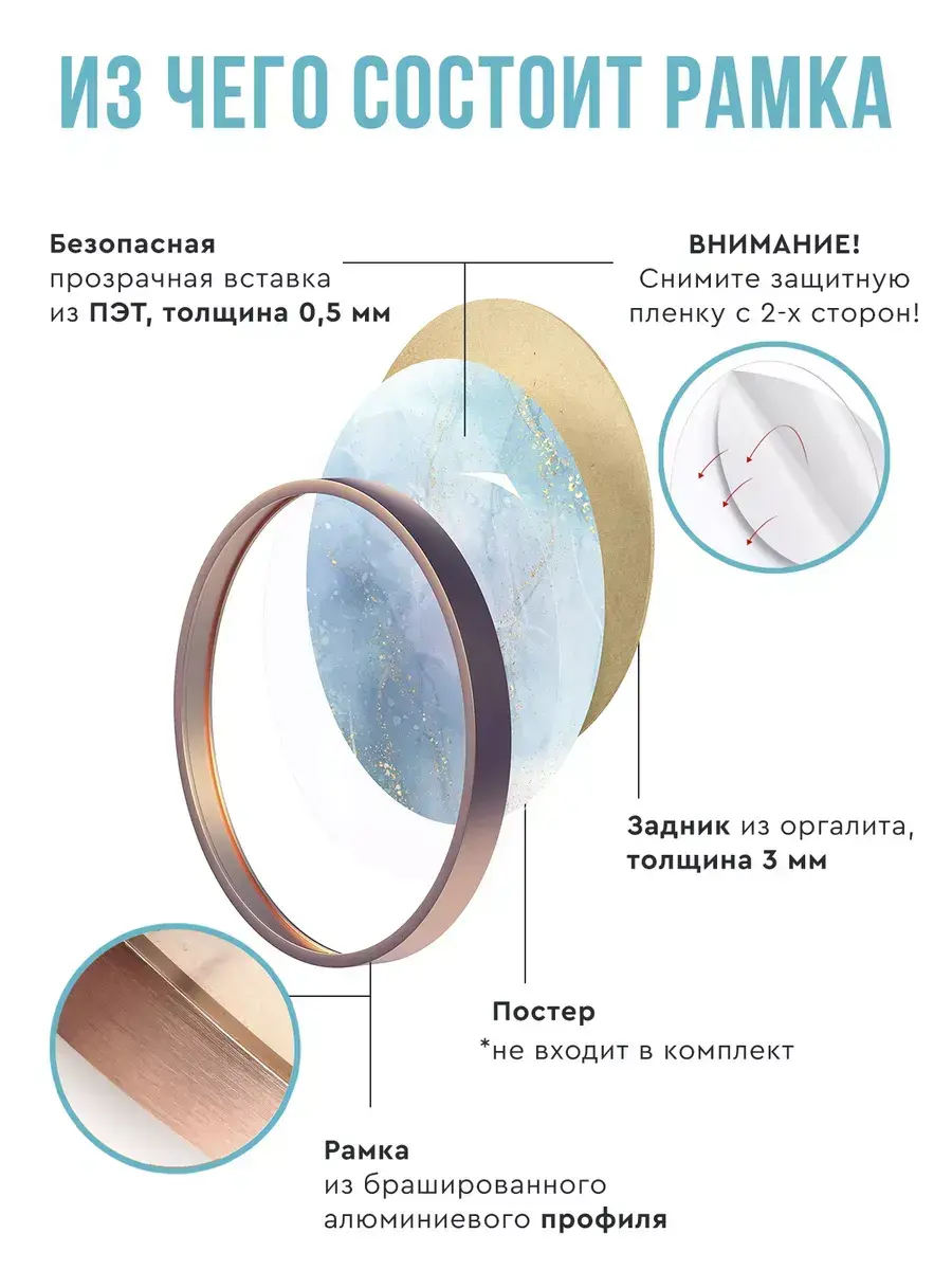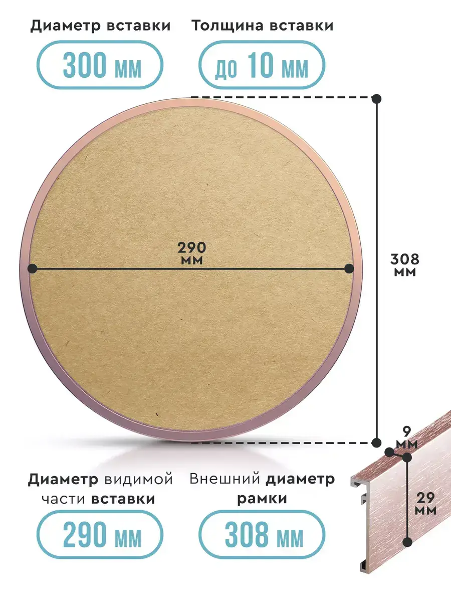 Круглая алюминиевая фоторамка 30 см. Габаритные размеры круглой металлической фоторамки - 308 мм. Диаметр видимой части - 290 мм. В круглую алюминиевую рамку 300 мм можно вставить постер, фото, алмазную мозаику, пазл, вышивку, зеркало, а также любую вставку, толщина которой не превышает 10 мм. Круглая металлическая рамка 30 см выполнена из легкого алюминия с красивой брашированной текстурой. В рамку для фото 30 см очень просто вставить изображение. Прижимные пружины вытаскиваются и вставляются без малейших усилий, но держат плотно и надежно. Подвес фоторамки также вставляется очень легко и свободно перемещается на любую точку окружности. Вместо стекла мы используем прозрачный пластик ПЭТ. Фоторамка 30 см получается легкой и безопасной - её невозможно разбить даже намеренно. При этом эстетические свойства круглой металлической рамки не теряются: ПЭТ не искажает изображение и обеспечивает абсолютную прозрачность. Не забудьте снять защитную пленку с прозрачной вставки с ДВУХ сторон! Произведено в России.