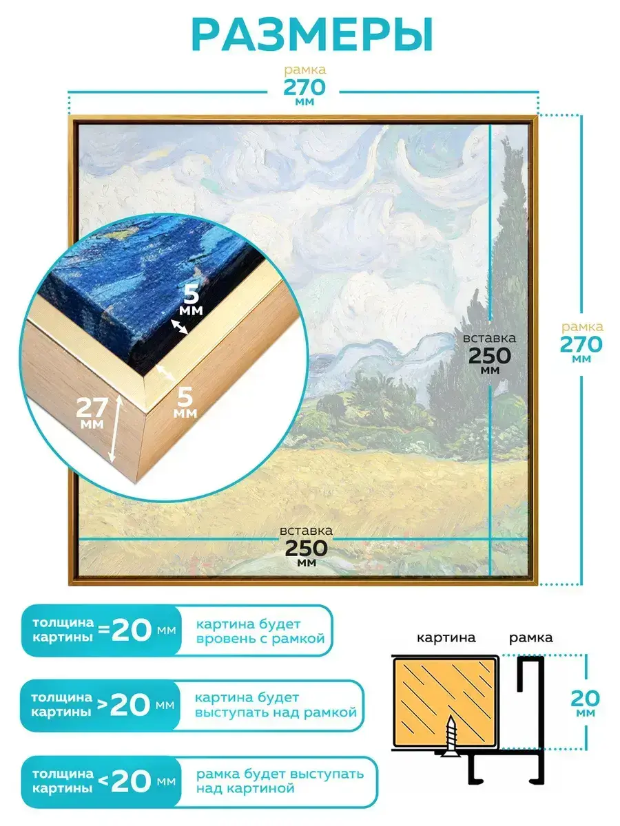 Металлическая багетная рама 25х25 см предназначена для картин на подрамнике. Размер 27х27 см — это размер подходящей вставки, а габариты самой рамки больше - 32х32 см. Подробный слайд со всеми размерами можно найти в фотографиях товара. Рама 25х25 см подойдет для картины на подрамнике, алмазной мозаики на подрамнике, картины по номерам на подрамнике. Глубина рамки 25х25 см - 20 мм. Если толщина вашей вставки - 20 мм, то вставка будет располагаться вровень с рамкой. Если толщина вашей вставки больше 20 мм - вставка будет выступать над рамкой. Если толщина вставки меньше 20 мм, то рамка будет выступать над вставкой. Благодаря уникальному конструктиву алюминиевой рамки 25х25 см, она красиво обрамляет холст, не утяжеляя его. Между подрамником и рамкой остается свободное пространство, что создает эффект «плавающей» картины. Картина на подрамнике крепится к металлической рамке 25х25 см саморезами, которые идут в комплекте с рамкой. Также в комплектацию рамки 25х25 см входит удобный подвес, двойные крепежные углы и отвертка. Подробный слайд с комплектацией можно найти в фотографиях карточки товара. Внимание! Рамка 25 на 25 см поставляется в прочном картонном тубусе в разобранном виде. Сборка рамки 25х25 см очень простая и не потребует много усилий. Благодаря своему стильному и минималистичному дизайну эта рама будет идеально вписываться в любой интерьер, будь то классический, современный или скандинавский стиль. Металлическая багетная рама 25х25 см от Designeroom не только украсит ваш дом, но и станет акцентом, подчеркивающим ваш вкус и стиль.