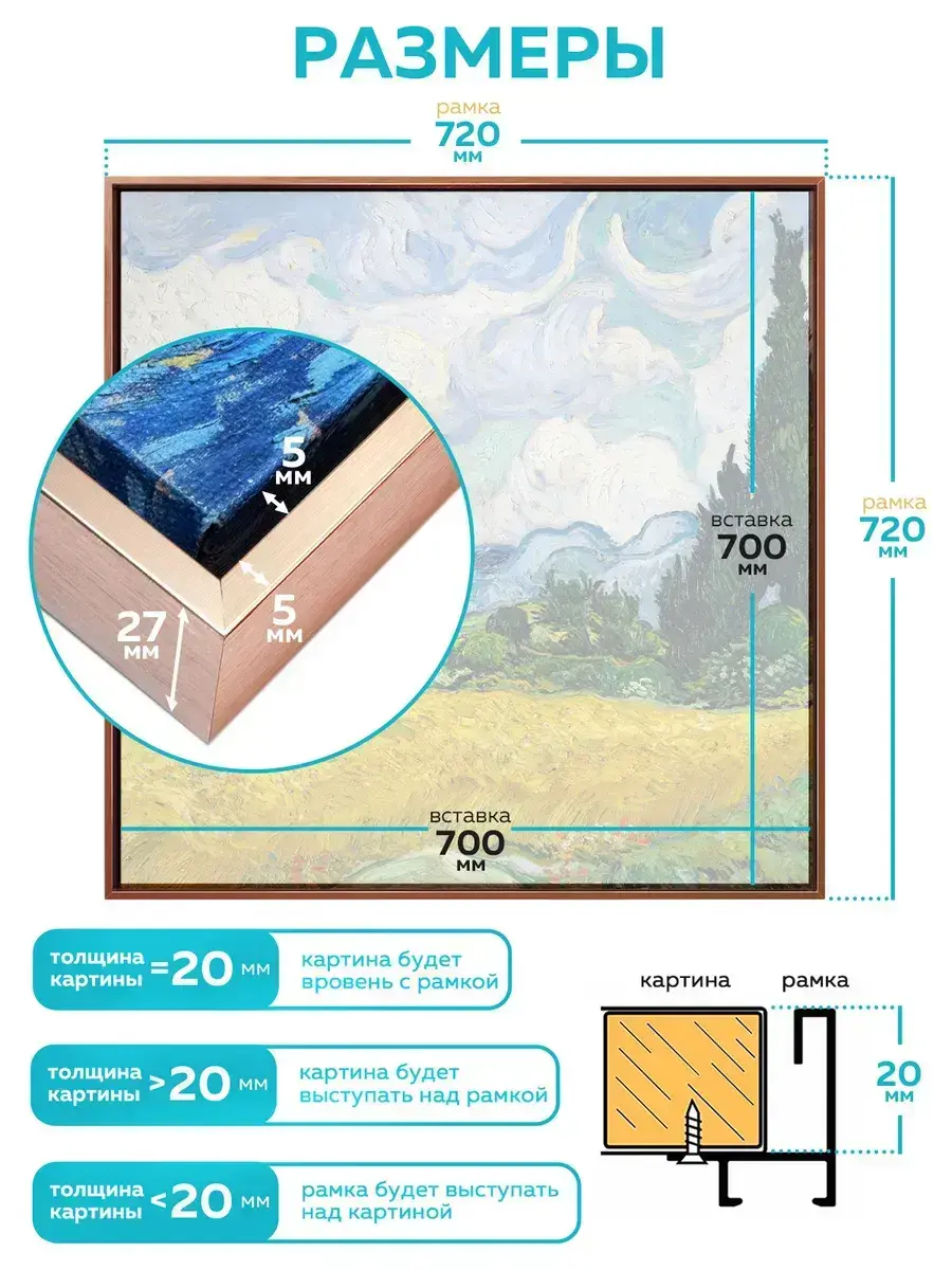 Металлическая багетная рама 70х70 см предназначена для картин на подрамнике. Размер 70х70 см — это размер подходящей вставки, а габариты самой рамки больше - 72х72 см. Подробный слайд со всеми размерами можно найти в фотографиях товара. Рама 70х70 см подойдет для картины на подрамнике, алмазной мозаики на подрамнике, картины по номерам на подрамнике. Глубина рамки 70х70 см - 20 мм. Если толщина вашей вставки - 20 мм, то вставка будет располагаться вровень с рамкой. Если толщина вашей вставки больше 20 мм - вставка будет выступать над рамкой. Если толщина вставки меньше 20 мм, то рамка будет выступать над вставкой. Благодаря уникальному конструктиву алюминиевой рамки 70х70 см, она красиво обрамляет холст, не утяжеляя его. Между подрамником и рамкой остается свободное пространство, что создает эффект «плавающей» картины. Картина на подрамнике крепится к металлической рамке 70х70 см саморезами, которые идут в комплекте с рамкой. Также в комплектацию рамки 70х70 см входит удобный подвес, двойные крепежные углы и отвертка. Подробный слайд с комплектацией можно найти в фотографиях карточки товара. Внимание! Рамка 70 на 70 см поставляется в прочном картонном тубусе в разобранном виде. Сборка рамки 70х70 см очень простая и не потребует много усилий. Благодаря своему стильному и минималистичному дизайну эта рама будет идеально вписываться в любой интерьер, будь то классический, современный или скандинавский стиль. Металлическая багетная рама 70х70 см от Designeroom не только украсит ваш дом, но и станет акцентом, подчеркивающим ваш вкус и стиль.