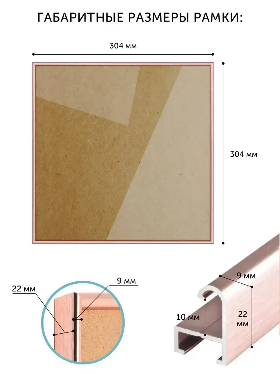 Алюминиевая рамка 30х30 см. Размеры фоторамки 30х30 указаны по размеру помещаемого вложения, а габаритные размеры квадратной рамки чуть больше: 304х304 мм (подробный слайд со всеми замерами находится в фотографиях). Металлическая рамка 30 на 30 подходит для постеров, фотографий, пазлов, алмазных мозаик и т. д. Вы можете вставить любое вложение, толщина которого не больше 5 мм. Рамка 30х30 для картины изготовлена из алюминиевого профиля, который обеспечивает прочность, коррозионную стойкость и долгий срок службы. В алюминиевой раме 30х30 используется прозрачный пластик ПЭТ, а не стекло. ПЭТ невозможно разбить, он безопасный, не искажает изображение и обеспечивает 100% прозрачность. Внимание! Снимите защитную пленку с 2 сторон со вставки из ПЭТ! Для жесткой фиксации изображения рамка для фото квадратная 30х30 комплектуется прижимными пружинами. Они очень плотно держат вставку, что позволяет использовать рамку 30 на 30 для пазлов, алмазных мозаик и т. д. Фоторамка квадратная 30 на 30 см очень надежно упакована. Риски повреждения при транспортировке сведены к минимуму. Чтобы вставить вложение в рамку для картины 30х30 Нельсон, необходимо открутить 2 винта. К каждой рамке 30х30 см прилагается инструкция по использованию, а более подробная инструкция выложена в фотографиях товара. Итак, рамка для фото 30х30 очень надежная и крепкая, несмотря на небольшой вес и тонкий изящный алюминиевый профиль. Рамка квадратная для фото 30х30 см стильная, универсальная, отлично смотрится и в домашних, и в офисных интерьерах. Рама багетная 30х30 не подвержена коррозии; не боится влаги и прямого солнечного света. Рамки 30х30 см не подвержены деформации и устойчивы к механическим повреждениям, прослужат долго. Несомненное преимущество багета 30х30 – безопасная прозрачная вставка из ПЭТ. Квадратную рамку 30 на 30 см можно красиво компоновать с другими размерами.