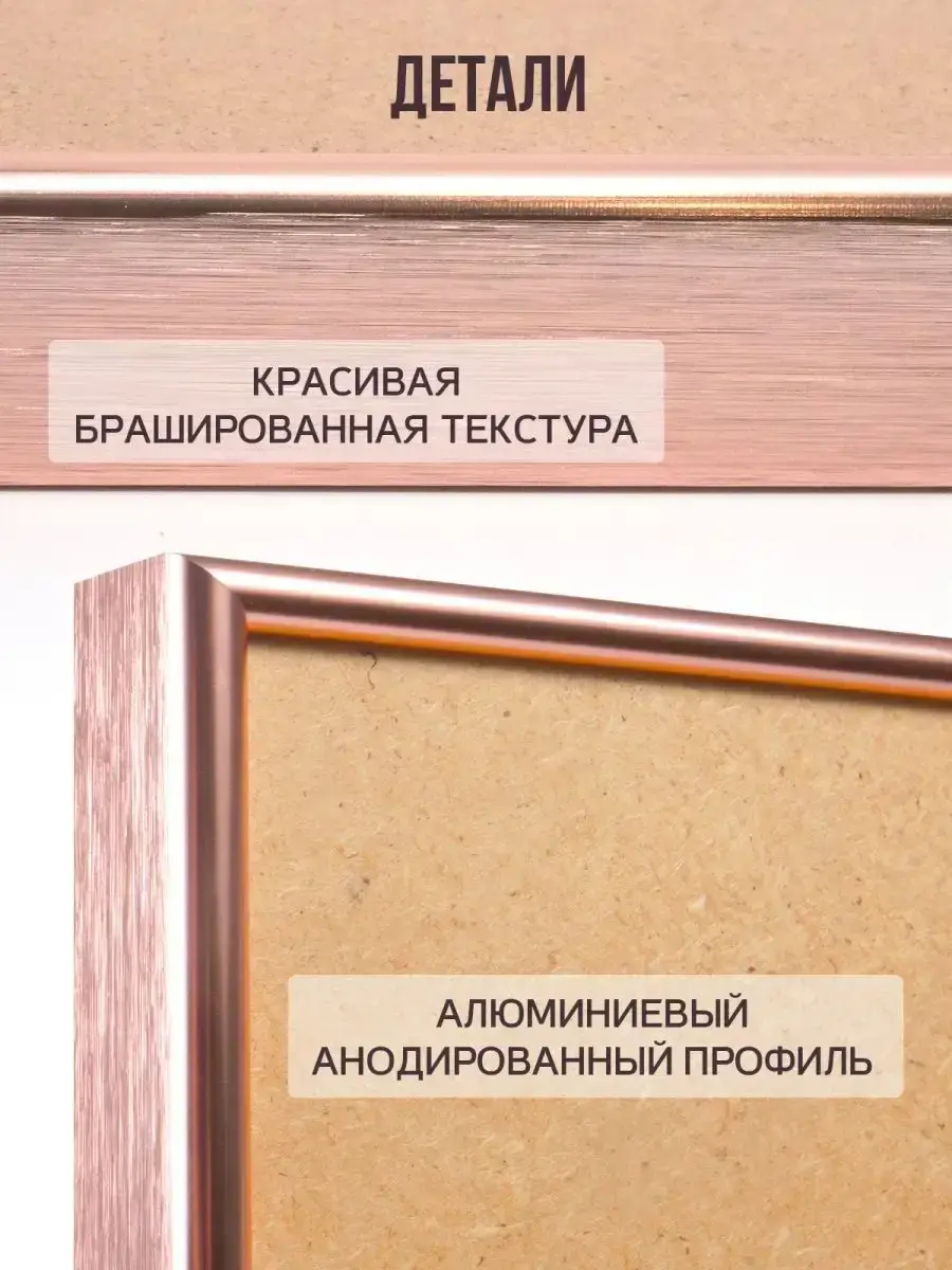 Брашированная алюминиевая рамка 40х50 см с быстрой сменой изображения. Достоинства фоторамки 40х50 см: крепкий стильный металлический каркас; прозрачная вставка из ПЭТ; небольшой вес. Основным преимуществом перед другими металлическими фоторамками 40 на 50 (типа Нельсон) является суперудобная и супербыстрая смена вложений: нужно просто сдвинуть прижимные пружины. В рамки 40 на 50 см можно вставить: постеры; фотографии; пазлы, алмазную мозаику, вышивку и т. д. Рамку для фото 40х50 см можно вешать и вертикально, и горизонтально. Металлические рамки 40х50 см изготовлены из анодированного алюминиевого профиля, укомплектованы жестким задником из оргалита 3 мм, защитным прозрачным пластиком ПЭТ 0,5 мм, металлическими пружинами/подвесами для фиксации вложения и размещения рамки на стене. Внимание! В рамке 40х50 см для постеров мы используем прозрачную вставку из ПЭТ толщиной 0,5 мм, а не стекло. Фоторамка 40х50 получается легкой и безопасной - её невозможно разбить даже намеренно. При этом эстетические свойства рамки 40 на 50 см не теряются: ПЭТ не искажает изображение и обеспечивает 100%-ю прозрачность. Внимание! Перед первым использованием рамки для картины 40х50 с пластиковой вставки необходимо снять защитную пленку с двух сторон! Внимание! Наши рамки 40 на 50 не предназначены для использования вне помещений.