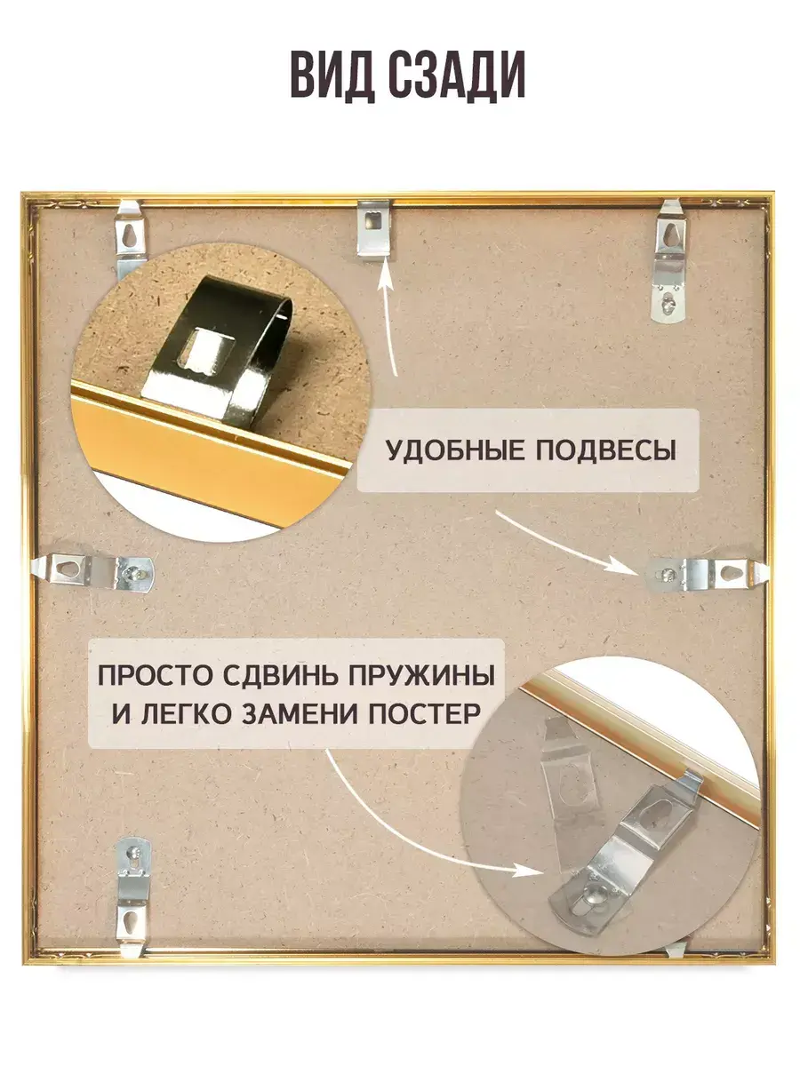 Брашированная алюминиевая анодированная рамка 45х45 см с быстрой сменой изображения, не требующая дополнительных инструментов. В этой фоторамке 45х45 см сохранены все достоинства: крепкий стильный металлический каркас; прозрачная вставка из ПЭТ; небольшой вес. Основным преимуществом над другими металлическими фоторамками (типа Нельсон) является супер удобная и супер быстрая смена вложений. Теперь рамку 45х45 не нужно разбирать, вам не понадобится отвертка. Достаточно просто сдвинуть пружины. В рамку 45 на 45 можно вставить: постеры; фотографии; холст на подрамнике толщиной до 15 мм; пазлы, алмазную мозаику, вышивку (или любое другое вложение, толщиной до 15 мм). Металлические рамки 45х45 см Designeroom изготовлены из анодированного алюминиевого профиля, укомплектованы жестким задником из оргалита 3 мм, защитным прозрачным пластиком ПЭТ 0,5 мм, металлическими пружинами/подвесами для фиксации вложения и размещения рамки на стене. Для жесткой фиксации изображения наши рамки 450х450 мм для постеров комплектуются прижимными пружинами/подвесами. Вместо стекла для безопасности мы используем прозрачную вставку из ПЭТ, толщиной 0,5 мм. Фоторамка 45х45 см получается легкой и безопасной - её невозможно разбить даже намеренно. При этом эстетические свойства рамки 45 на 45 не теряются: ПЭТ не искажает изображение и обеспечивает 100%-ю прозрачность. Внимание! Перед первым использованием с пластиковой вставки необходимо снять защитную пленку с двух сторон! Внимание! Наши рамки не предназначены для использования вне помещений.