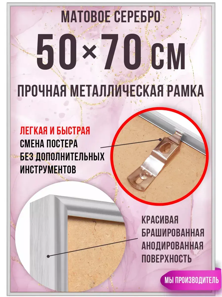 Брашированная алюминиевая рамка 50х70 см с быстрой сменой изображения. Достоинства фоторамки 50х70 см: крепкий стильный металлический каркас; прозрачная вставка из ПЭТ; небольшой вес. Основным преимуществом перед другими металлическими фоторамками 50 на 70 (типа Нельсон) является суперудобная и супербыстрая смена вложений: нужно просто сдвинуть прижимные пружины. В рамки 50 на 70 см можно вставить: постеры; фотографии; пазлы, алмазную мозаику, вышивку и т. д. Рамку для фото 50х70 см можно вешать и вертикально, и горизонтально. Металлические рамки 50х70 см изготовлены из анодированного алюминиевого профиля, укомплектованы жестким задником из оргалита 3 мм, защитным прозрачным пластиком ПЭТ 0,5 мм, металлическими пружинами/подвесами для фиксации вложения и размещения рамки на стене. Внимание! В рамке 50х70 см для постеров мы используем прозрачную вставку из ПЭТ толщиной 0,5 мм, а не стекло. Фоторамка 50х70 получается легкой и безопасной - её невозможно разбить даже намеренно. При этом эстетические свойства рамки 50 на 70 см не теряются: ПЭТ не искажает изображение и обеспечивает 100%-ю прозрачность. Внимание! Перед первым использованием рамки для картины 50х70 с пластиковой вставки необходимо снять защитную пленку с двух сторон! Внимание! Наши рамки 50 на 70 не предназначены для использования вне помещений.