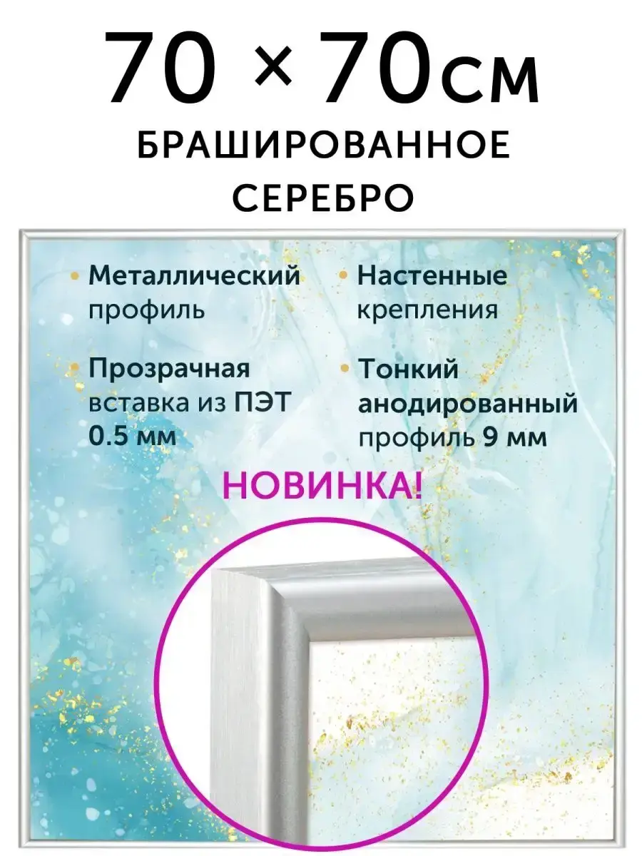 Алюминиевая рамка 70х70 см. Размеры фоторамки 70х70 указаны по размеру помещаемого вложения, а габаритные размеры рамки чуть больше: 704х704 мм (подробный слайд со всеми замерами находится в фотографиях). Квадратная рамка 70х70 подходят для постеров, фотографий, пазлов, алмазных мозаик и т. д. Вы можете вставить любое вложение, толщина которого не больше 5 мм. Рамка квадратная 70х70 изготовлена из алюминиевого профиля, который обеспечивает прочность, коррозионную стойкость и долгий срок службы. В алюминиевой рамке 70 на 70 используется прозрачный пластик ПЭТ, а не стекло. ПЭТ невозможно разбить, он безопасный, не искажает изображение и обеспечивает 70% прозрачность. Внимание! Снимите защитную пленку с 2 сторон со вставки из ПЭТ! Для жесткой фиксации изображения рама 70х70 комплектуется прижимными пружинами. Они очень плотно держат вставку, что позволяет использовать рамки 70 на 70 для пазлов, алмазных мозаик и т. д. Фоторамка 70х70 очень надежно упакована. Риски повреждения при транспортировке сведены к минимуму. Чтобы вставить вложение в раму для картины 70х70, необходимо открутить 2 винта. К каждой рамке 70 на 70 прилагается инструкция по использованию, а более подробная инструкция выложена в фотографиях товара. Итак, рамка для фото квадратная 70х70 см очень надежная и крепкая, несмотря на небольшой вес и тонкий изящный алюминиевый профиль. Рамка для фото 70х70 стильная, универсальная, отлично смотрится и в домашних, и в офисных интерьерах. Рамки 70 на 70 не подвержены коррозии; не боятся влаги и прямого солнечного света. Рамки 70х70 не подвержены деформации и устойчивы к механическим повреждениям, прослужат долго. Несомненное преимущество рамки 70х70 для картины – безопасная прозрачная вставка из ПЭТ. Рамку квадратную можно красиво компоновать с другими размерами.
