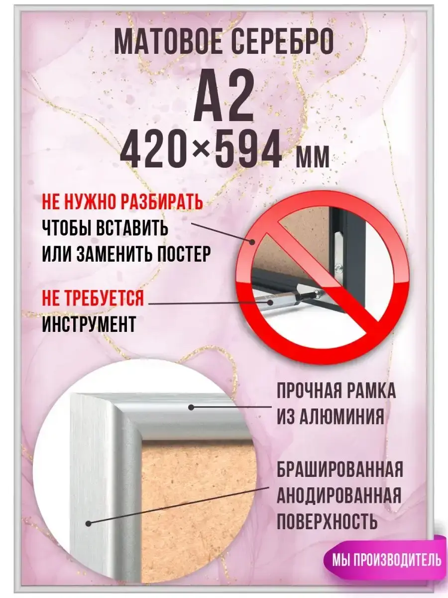 Брашированная алюминиевая рамка А2 (420х594 мм) с быстрой сменой изображения. Достоинства фоторамки А2: крепкий стильный металлический каркас; прозрачная вставка из ПЭТ; небольшой вес. Основным преимуществом перед другими металлическими фоторамками А2 (типа Нельсон) является суперудобная и супербыстрая смена вложений: нужно просто сдвинуть прижимные пружины. В рамки формата А2 можно вставить: постеры; фотографии; пазлы, алмазную мозаику, вышивку и т. д. Рамку для фото А2 можно вешать и вертикально, и горизонтально. Металлические рамки А2 изготовлены из анодированного алюминиевого профиля, укомплектованы жестким задником из оргалита 3 мм, защитным прозрачным пластиком ПЭТ 0,5 мм, металлическими пружинами/подвесами для фиксации вложения и размещения рамки на стене. Внимание! В рамке А2 для постеров мы используем прозрачную вставку из ПЭТ толщиной 0,5 мм, а не стекло. Фоторамка А2 получается легкой и безопасной - её невозможно разбить даже намеренно. При этом эстетические свойства рамки 420х594 мм не теряются: ПЭТ не искажает изображение и обеспечивает 100%-ю прозрачность. Внимание! Перед первым использованием рамки для картины А2 с пластиковой вставки необходимо снять защитную пленку с двух сторон! Внимание! Наши рамки формата А2 не предназначены для использования вне помещений.