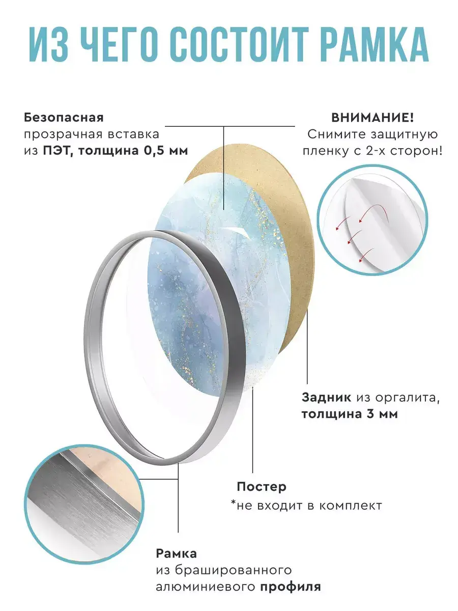 Круглая алюминиевая фоторамка 60 см. Габаритные размеры круглой металлической фоторамки - 608 мм. Диаметр видимой части вставки - 590 мм. В круглую алюминиевую рамку 600 мм можно вставить постер, фото, алмазную мозаику, пазл, вышивку, зеркало, а также любую вставку, толщина которой не превышает 10 мм. Круглая металлическая рамка 60 см выполнена из легкого алюминия с красивой брашированной текстурой. В рамку для фото 60 см очень просто вставить изображение. Прижимные пружины вытаскиваются и вставляются без малейших усилий, но держат плотно и надежно. Подвес фоторамки также вставляется очень легко и свободно перемещается на любую точку окружности. Вместо стекла мы используем прозрачный пластик ПЭТ. Фоторамка 60 см получается легкой и безопасной - её невозможно разбить даже намеренно. При этом эстетические свойства круглой металлической рамки не теряются: ПЭТ не искажает изображение и обеспечивает абсолютную прозрачность. Не забудьте снять защитную пленку с прозрачной вставки с ДВУХ сторон! Произведено в России.