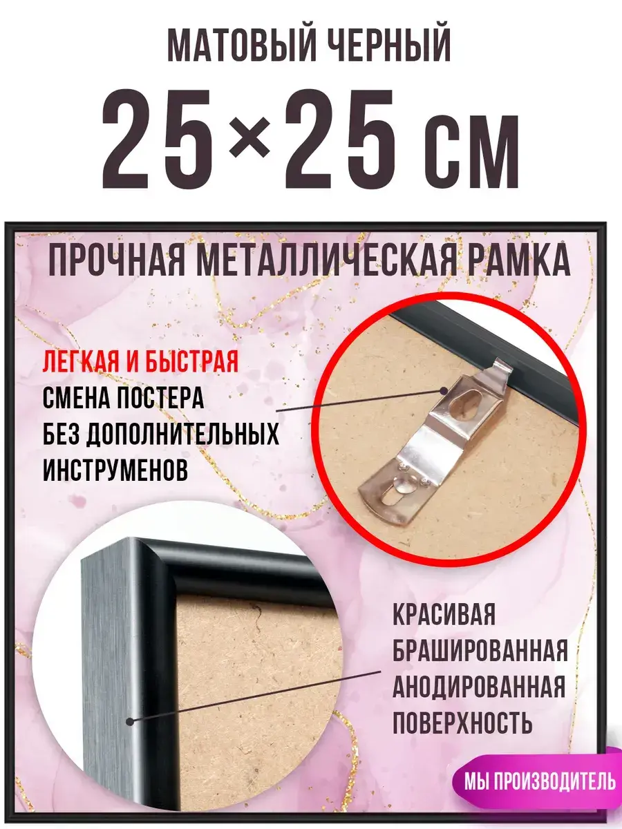 Брашированная алюминиевая рамка 25х25 см с быстрой сменой изображения. Достоинства фоторамки 25х25 см: крепкий стильный металлический каркас; прозрачная вставка из ПЭТ; небольшой вес. Основным преимуществом перед другими металлическими фоторамками 25 на 25 (типа Нельсон) является суперудобная и супербыстрая смена вложений: нужно просто сдвинуть прижимные пружины. В рамки 25 на 25 см можно вставить: постеры; фотографии; пазлы, алмазную мозаику, вышивку и т. д. Рамку для фото 25х25 см можно вешать и вертикально, и горизонтально. Металлические рамки 25х25 см изготовлены из анодированного алюминиевого профиля, укомплектованы жестким задником из оргалита 3 мм, защитным прозрачным пластиком ПЭТ 0,5 мм, металлическими пружинами/подвесами для фиксации вложения и размещения рамки на стене. Внимание! В рамке 25х25 см для постеров мы используем прозрачную вставку из ПЭТ толщиной 0,5 мм, а не стекло. Фоторамка 25х25 получается легкой и безопасной - её невозможно разбить даже намеренно. При этом эстетические свойства рамки 25 на 25 см не теряются: ПЭТ не искажает изображение и обеспечивает 100%-ю прозрачность. Внимание! Перед первым использованием рамки для картины 25х25 с пластиковой вставки необходимо снять защитную пленку с двух сторон! Внимание! Наши рамки 25 на 25 не предназначены для использования вне помещений.