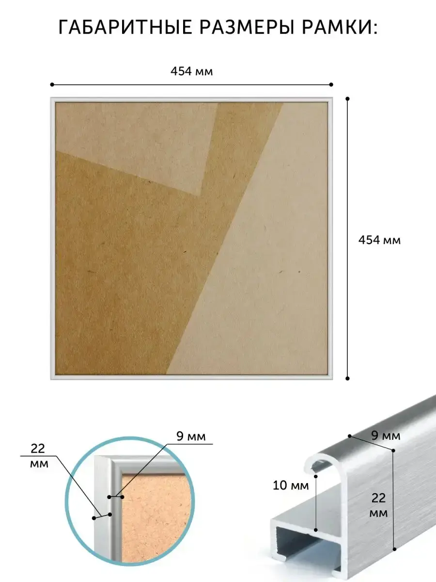 Алюминиевая рамка 45х45 см. Размеры фоторамки 45х45 указаны по размеру помещаемого вложения, а габаритные размеры рамки чуть больше: 454х454 мм (подробный слайд со всеми замерами находится в фотографиях). Квадратная рамка 45х45 подходят для постеров, фотографий, пазлов, алмазных мозаик и т. д. Вы можете вставить любое вложение, толщина которого не больше 5 мм. Рамка квадратная 45х45 изготовлена из алюминиевого профиля, который обеспечивает прочность, коррозионную стойкость и долгий срок службы. В алюминиевой рамке 45 на 45 используется прозрачный пластик ПЭТ, а не стекло. ПЭТ невозможно разбить, он безопасный, не искажает изображение и обеспечивает 45% прозрачность. Внимание! Снимите защитную пленку с 2 сторон со вставки из ПЭТ! Для жесткой фиксации изображения рама 45х45 комплектуется прижимными пружинами. Они очень плотно держат вставку, что позволяет использовать рамки 45 на 45 для пазлов, алмазных мозаик и т. д. Фоторамка 45х45 очень надежно упакована. Риски повреждения при транспортировке сведены к минимуму. Чтобы вставить вложение в раму для картины 45х45, необходимо открутить 2 винта. К каждой рамке 45 на 45 прилагается инструкция по использованию, а более подробная инструкция выложена в фотографиях товара. Итак, рамка для фото квадратная 45х45 см очень надежная и крепкая, несмотря на небольшой вес и тонкий изящный алюминиевый профиль. Рамка для фото 45х45 стильная, универсальная, отлично смотрится и в домашних, и в офисных интерьерах. Рамки 45 на 45 не подвержены коррозии; не боятся влаги и прямого солнечного света. Рамки 45х45 не подвержены деформации и устойчивы к механическим повреждениям, прослужат долго. Несомненное преимущество рамки 45х45 для картины – безопасная прозрачная вставка из ПЭТ. Рамку квадратную можно красиво компоновать с другими размерами.