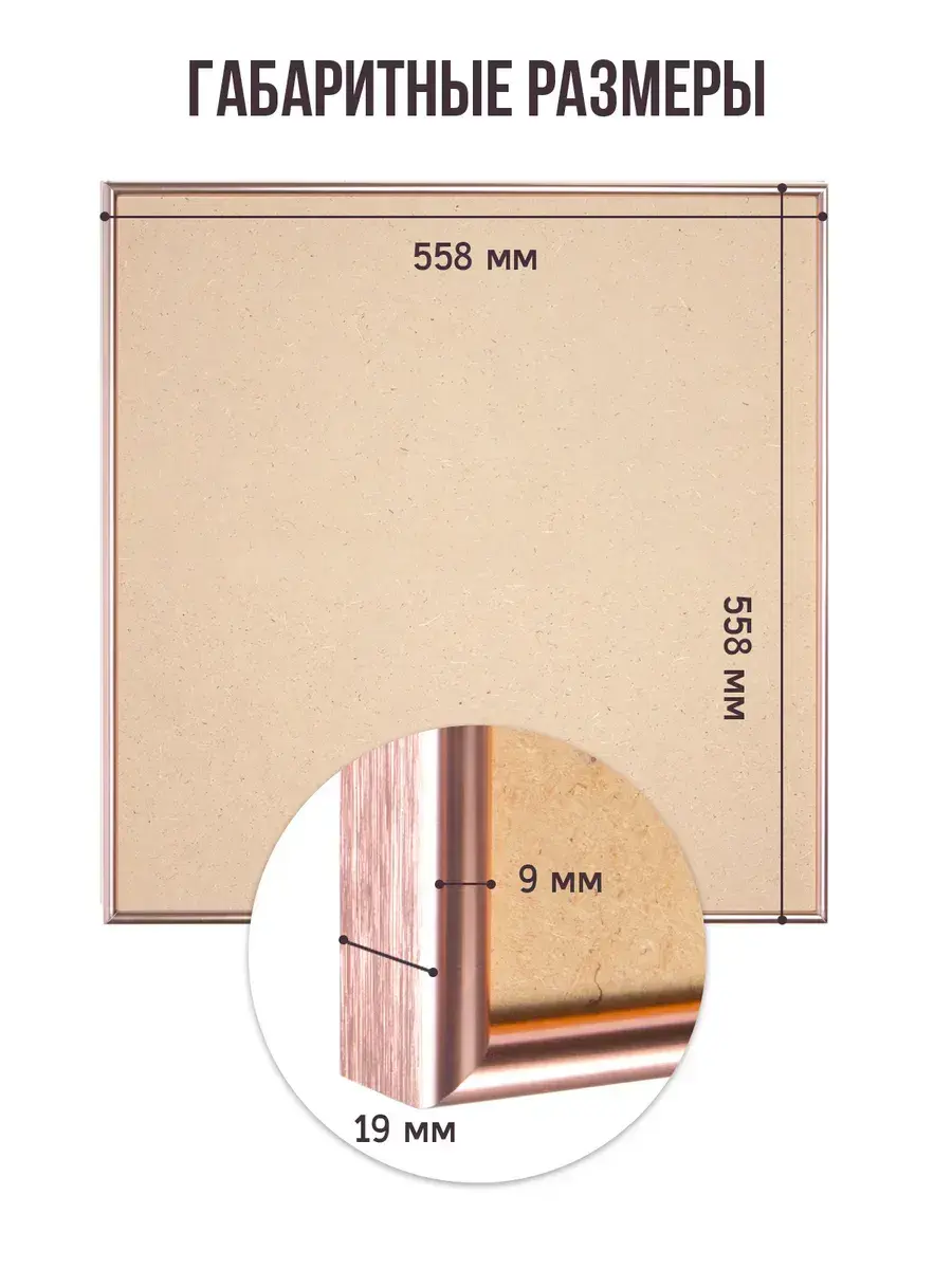 Брашированная алюминиевая рамка 55х55 см с быстрой сменой изображения. Достоинства фоторамки 55х55 см: крепкий стильный металлический каркас; прозрачная вставка из ПЭТ; небольшой вес. Основным преимуществом перед другими металлическими фоторамками 55 на 55 (типа Нельсон) является суперудобная и супербыстрая смена вложений: нужно просто сдвинуть прижимные пружины. В рамки 55 на 55 см можно вставить: постеры; фотографии; пазлы, алмазную мозаику, вышивку и т. д. Рамку для фото 55х55 см можно вешать и вертикально, и горизонтально. Металлические рамки 55х55 см изготовлены из анодированного алюминиевого профиля, укомплектованы жестким задником из оргалита 3 мм, защитным прозрачным пластиком ПЭТ 0,5 мм, металлическими пружинами/подвесами для фиксации вложения и размещения рамки на стене. Внимание! В рамке 55х55 см для постеров мы используем прозрачную вставку из ПЭТ толщиной 0,5 мм, а не стекло. Фоторамка 55х55 получается легкой и безопасной - её невозможно разбить даже намеренно. При этом эстетические свойства рамки 55 на 55 см не теряются: ПЭТ не искажает изображение и обеспечивает 100%-ю прозрачность. Внимание! Перед первым использованием рамки для картины 55х55 с пластиковой вставки необходимо снять защитную пленку с двух сторон! Внимание! Наши рамки 55 на 55 не предназначены для использования вне помещений.