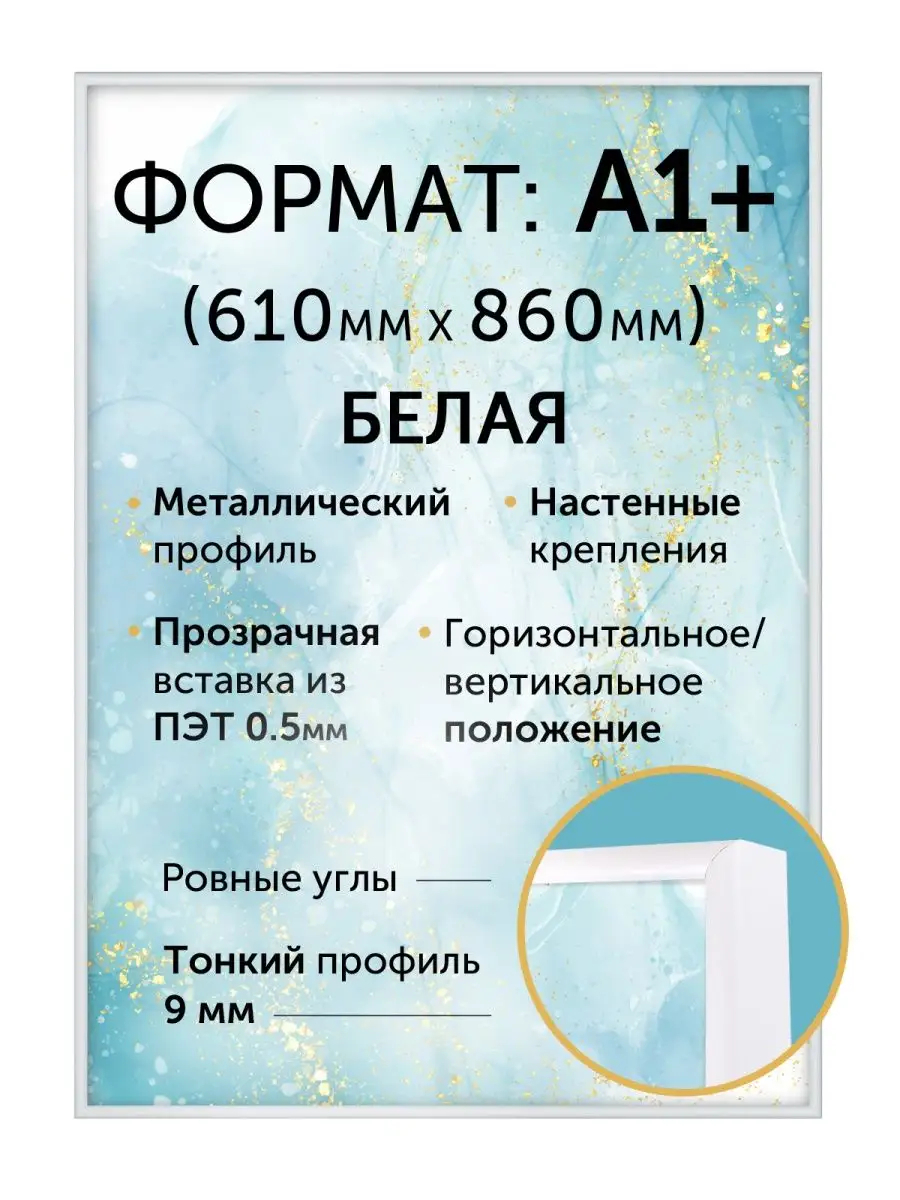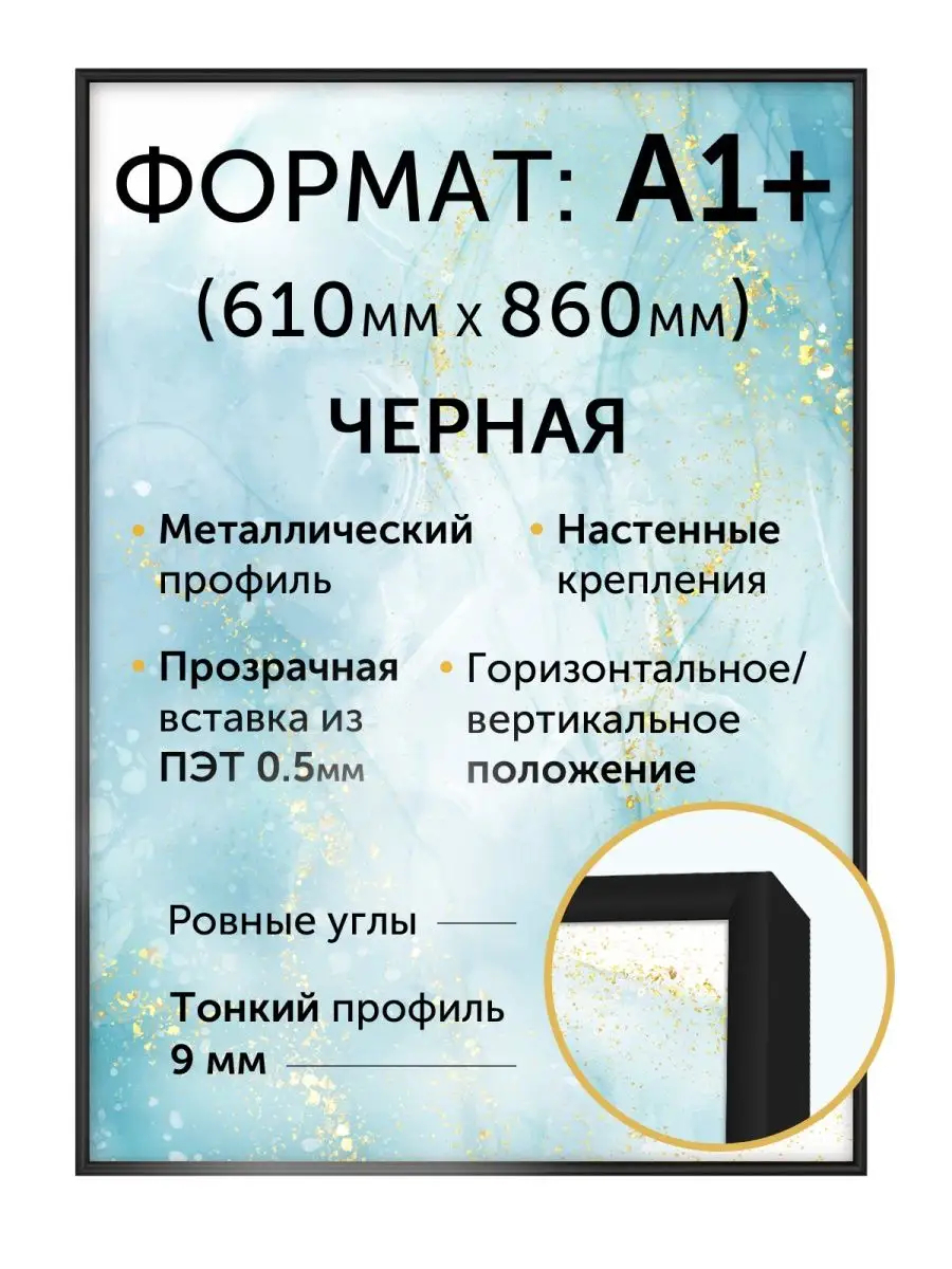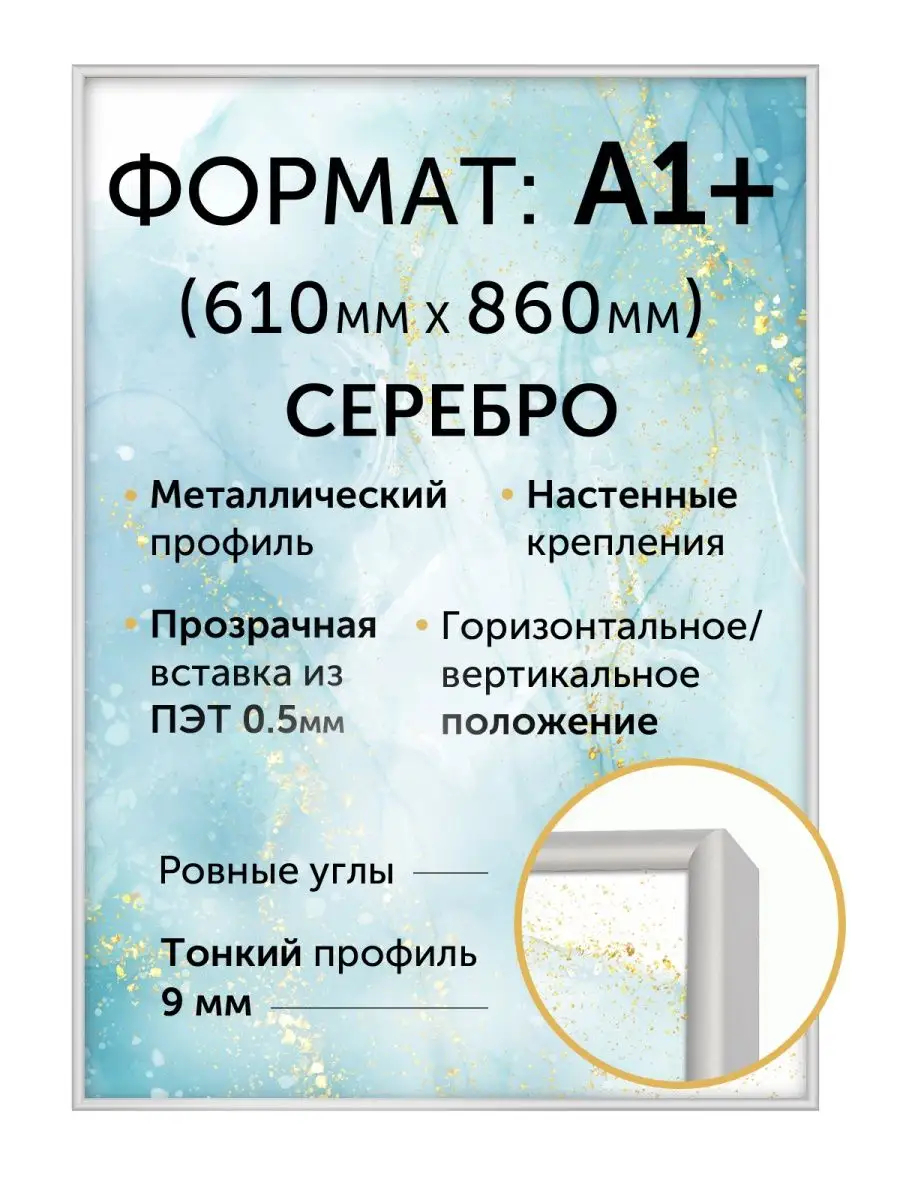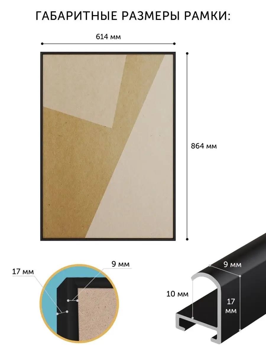 Алюминиевая рамка 61х86 см. Размеры фоторамки 60х90 указаны по размеру помещаемого вложения, а габаритные размеры рамки чуть больше: 614х864 мм (подробный слайд со всеми замерами находится в фотографиях). Рамка 61х86 подходят для постеров, фотографий, пазлов, алмазных мозаик и т. д. Вы можете вставить любое вложение, толщина которого не больше 5 мм. Рамка для постера 61х86 изготовлена из алюминиевого профиля, который обеспечивает прочность, коррозионную стойкость и долгий срок службы. В алюминиевой рамке 61 на 86 используется прозрачный пластик ПЭТ, а не стекло. ПЭТ невозможно разбить, он безопасный, не искажает изображение и обеспечивает 100% прозрачность. Внимание! Снимите защитную пленку с 2 сторон со вставки из ПЭТ! Для жесткой фиксации изображения рама 61х86 комплектуется прижимными пружинами. Они очень плотно держат вставку, что позволяет использовать рамки для пазлов, алмазных мозаик и т. д. Чтобы вставить изображение в раму для картины 61х86, необходимо открутить 2 винта. К каждой рамке прилагается инструкция по использованию, а более подробная инструкция выложена в фотографиях товара. Итак, рамки 61х86см очень надежные и крепкие, несмотря на небольшой вес и тонкий изящный алюминиевый профиль. Рамка для фото 61х86 стильная, универсальная, отлично смотрится и в домашних, и в офисных интерьерах. Алюминиевые рамки не подвержены коррозии; не боятся влаги и прямого солнечного света, не подвержены деформации и устойчивы к механическим повреждениям. Несомненное преимущество рамки 61х86 для картины – безопасная прозрачная вставка из ПЭТ. Рамку 61х86 можно красиво компоновать с другими размерами.
