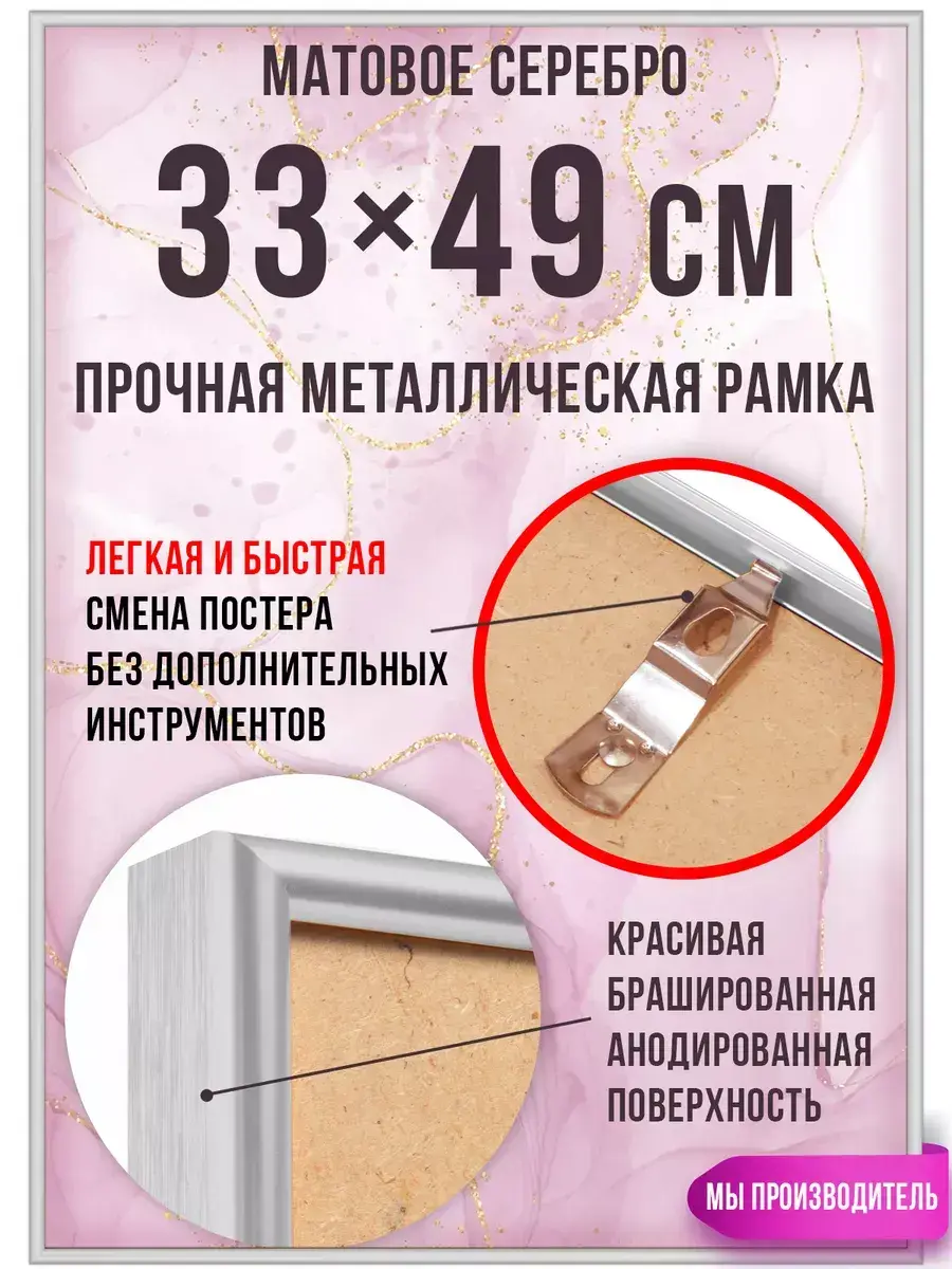 Брашированная алюминиевая рамка 33х49 см с быстрой сменой изображения. Достоинства фоторамки 33х49 см: крепкий стильный металлический каркас; прозрачная вставка из ПЭТ; небольшой вес. Основным преимуществом перед другими металлическими фоторамками 33 на 49 (типа Нельсон) является суперудобная и супербыстрая смена вложений: нужно просто сдвинуть прижимные пружины. В рамки 33 на 49 см можно вставить: постеры; фотографии; пазлы, алмазную мозаику, вышивку и т. д. Рамку для фото 33х49 см можно вешать и вертикально, и горизонтально. Металлические рамки 33х49 см изготовлены из анодированного алюминиевого профиля, укомплектованы жестким задником из оргалита 3 мм, защитным прозрачным пластиком ПЭТ 0,5 мм, металлическими пружинами/подвесами для фиксации вложения и размещения рамки на стене. Внимание! В рамке 33х49 см для постеров мы используем прозрачную вставку из ПЭТ толщиной 0,5 мм, а не стекло. Фоторамка 33х49 получается легкой и безопасной - её невозможно разбить даже намеренно. При этом эстетические свойства рамки 33 на 49 см не теряются: ПЭТ не искажает изображение и обеспечивает 100%-ю прозрачность. Внимание! Перед первым использованием рамки для картины 33х49 с пластиковой вставки необходимо снять защитную пленку с двух сторон! Внимание! Наши рамки 33 на 49 не предназначены для использования вне помещений.