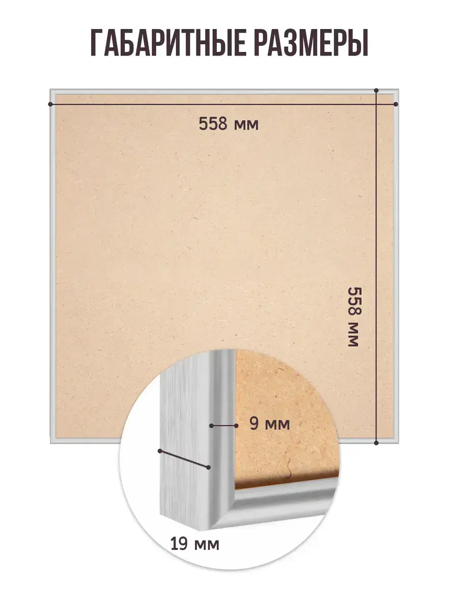 Брашированная алюминиевая рамка 55х55 см с быстрой сменой изображения. Достоинства фоторамки 55х55 см: крепкий стильный металлический каркас; прозрачная вставка из ПЭТ; небольшой вес. Основным преимуществом перед другими металлическими фоторамками 55 на 55 (типа Нельсон) является суперудобная и супербыстрая смена вложений: нужно просто сдвинуть прижимные пружины. В рамки 55 на 55 см можно вставить: постеры; фотографии; пазлы, алмазную мозаику, вышивку и т. д. Рамку для фото 55х55 см можно вешать и вертикально, и горизонтально. Металлические рамки 55х55 см изготовлены из анодированного алюминиевого профиля, укомплектованы жестким задником из оргалита 3 мм, защитным прозрачным пластиком ПЭТ 0,5 мм, металлическими пружинами/подвесами для фиксации вложения и размещения рамки на стене. Внимание! В рамке 55х55 см для постеров мы используем прозрачную вставку из ПЭТ толщиной 0,5 мм, а не стекло. Фоторамка 55х55 получается легкой и безопасной - её невозможно разбить даже намеренно. При этом эстетические свойства рамки 55 на 55 см не теряются: ПЭТ не искажает изображение и обеспечивает 100%-ю прозрачность. Внимание! Перед первым использованием рамки для картины 55х55 с пластиковой вставки необходимо снять защитную пленку с двух сторон! Внимание! Наши рамки 55 на 55 не предназначены для использования вне помещений.
