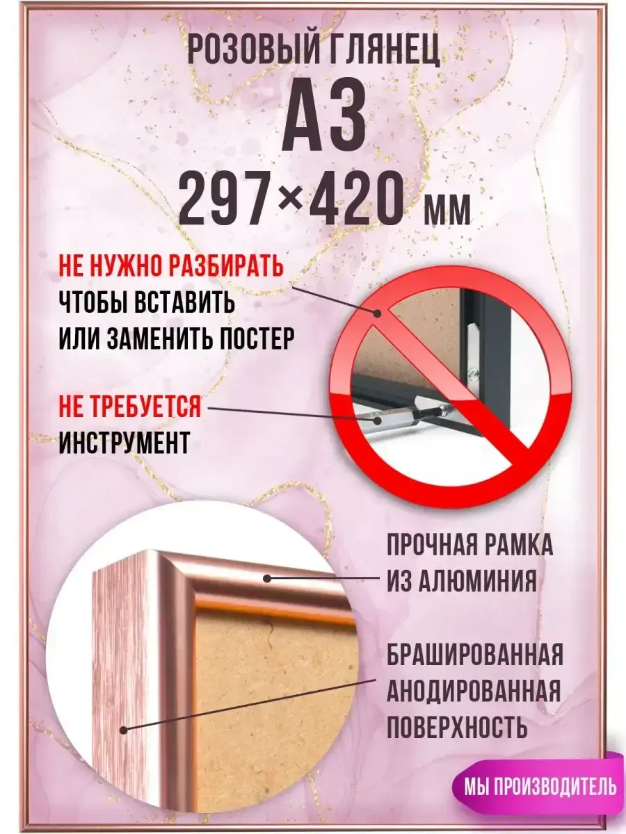 Брашированная алюминиевая рамка А3 (297х420 мм) с быстрой сменой изображения. Достоинства фоторамки А3: крепкий стильный металлический каркас; прозрачная вставка из ПЭТ; небольшой вес. Основным преимуществом перед другими металлическими фоторамками А3 (типа Нельсон) является суперудобная и супербыстрая смена вложений: нужно просто сдвинуть прижимные пружины. В рамки формата А3 можно вставить: постеры; фотографии; пазлы, алмазную мозаику, вышивку и т. д. Рамку для фото А3 можно вешать и вертикально, и горизонтально. Металлические рамки А3 изготовлены из анодированного алюминиевого профиля, укомплектованы жестким задником из оргалита 3 мм, защитным прозрачным пластиком ПЭТ 0,5 мм, металлическими пружинами/подвесами для фиксации вложения и размещения рамки на стене. Внимание! В рамке А3 для постеров мы используем прозрачную вставку из ПЭТ толщиной 0,5 мм, а не стекло. Фоторамка А3 получается легкой и безопасной - её невозможно разбить даже намеренно. При этом эстетические свойства рамки 297х420 мм не теряются: ПЭТ не искажает изображение и обеспечивает 100%-ю прозрачность. Внимание! Перед первым использованием рамки для картины А3 с пластиковой вставки необходимо снять защитную пленку с двух сторон! Внимание! Наши рамки формата А3 не предназначены для использования вне помещений.